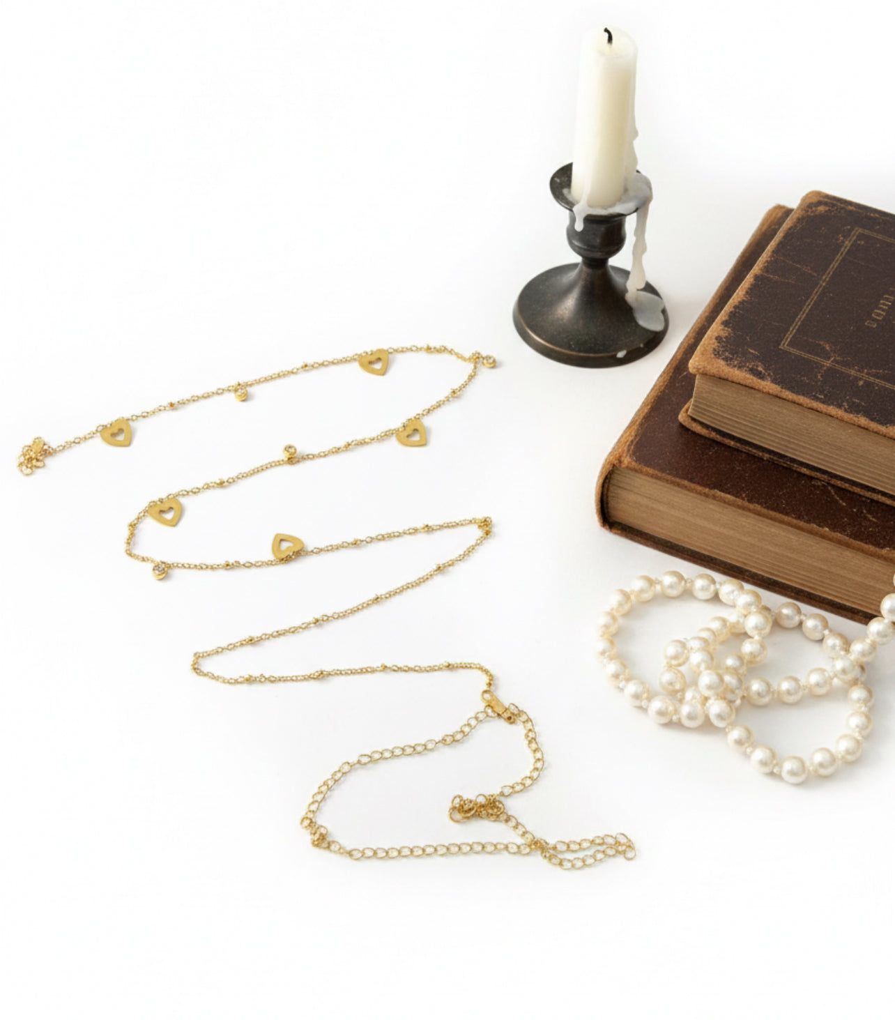 A charming gold-tone hip chain with crystal beads and heart charms.