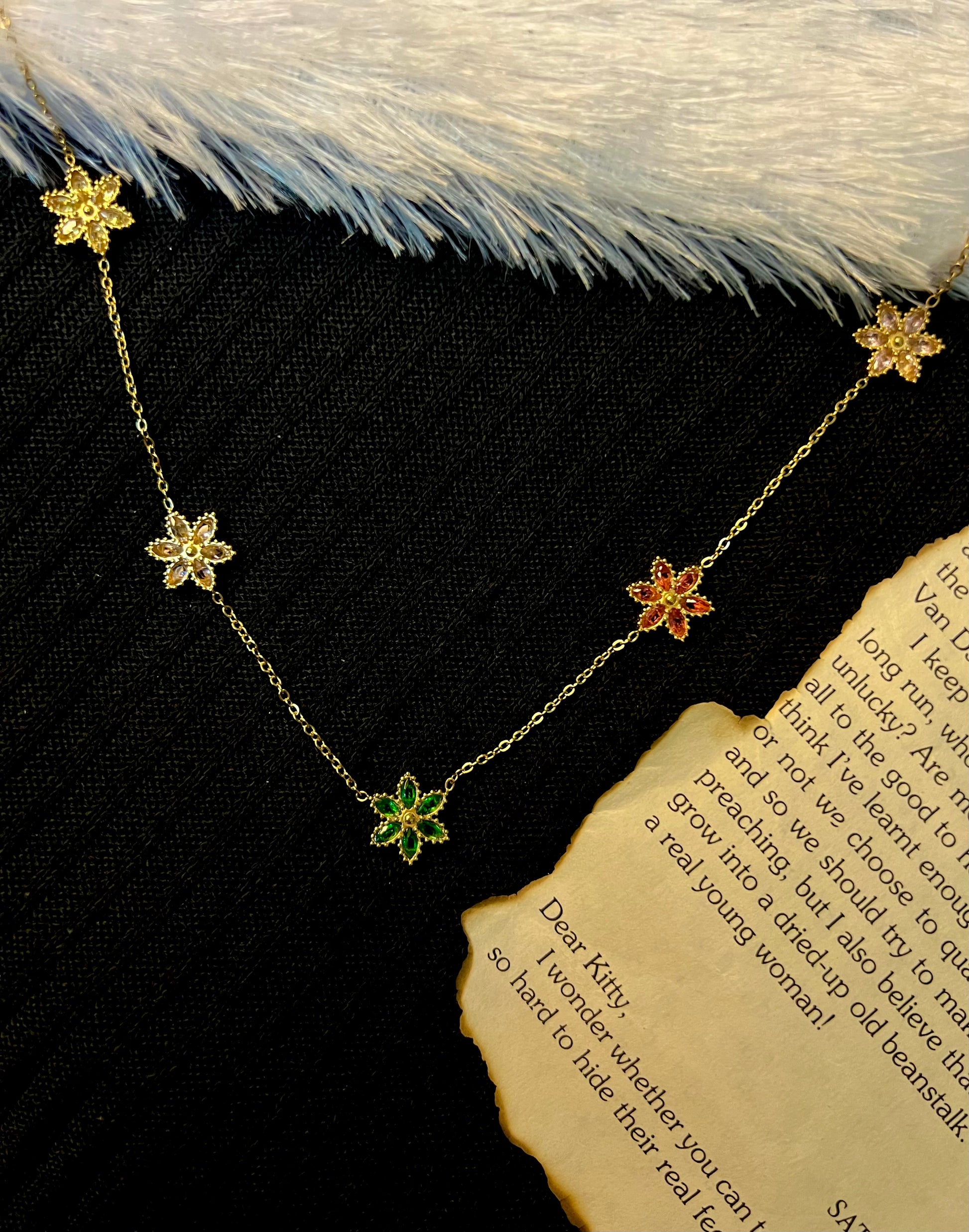 A beautiful gold tone chain featuring small, sparkling flower charmsย evenly spaced along its length.