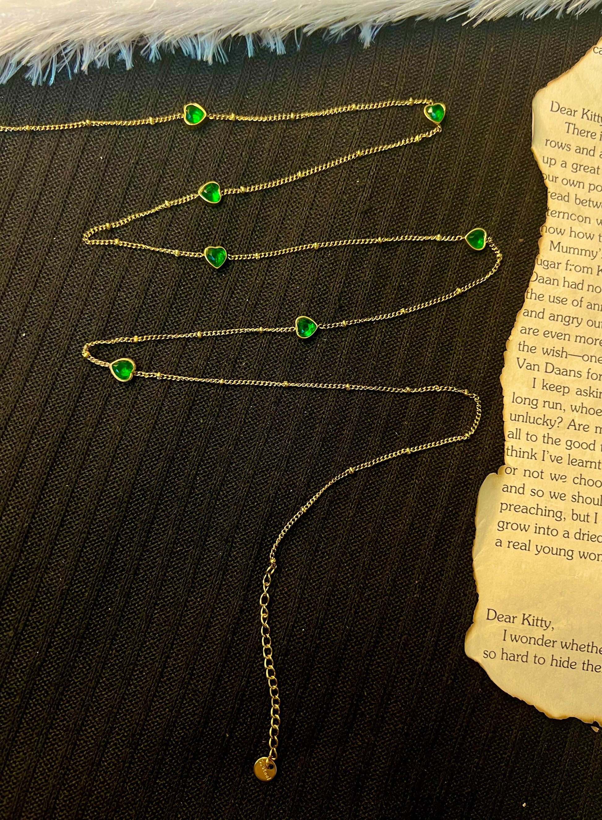 A beautiful minimal hip chain with emerald heart charms.