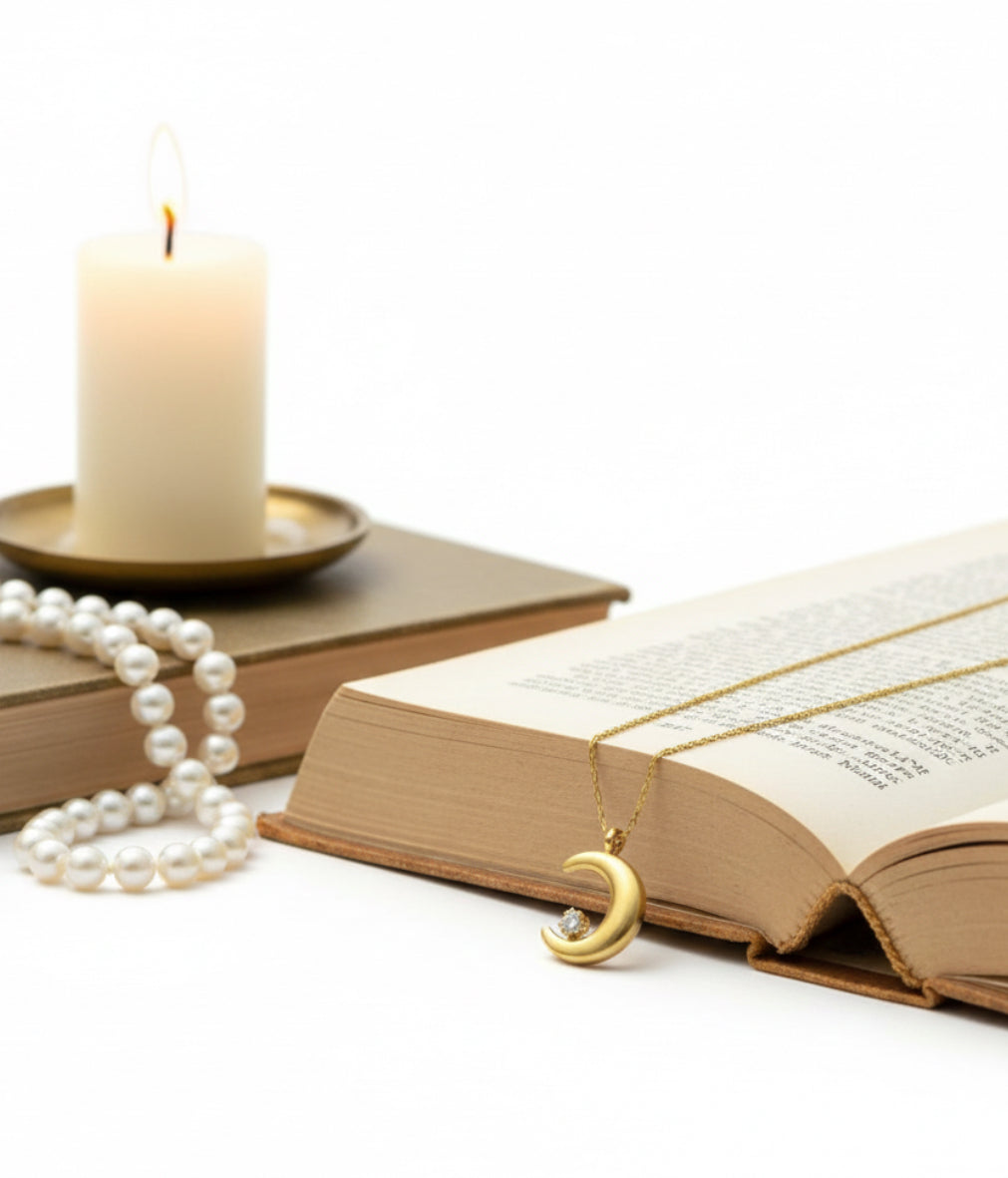 A beautiful gold tone half moon shaped pendant with a white stone in the center.