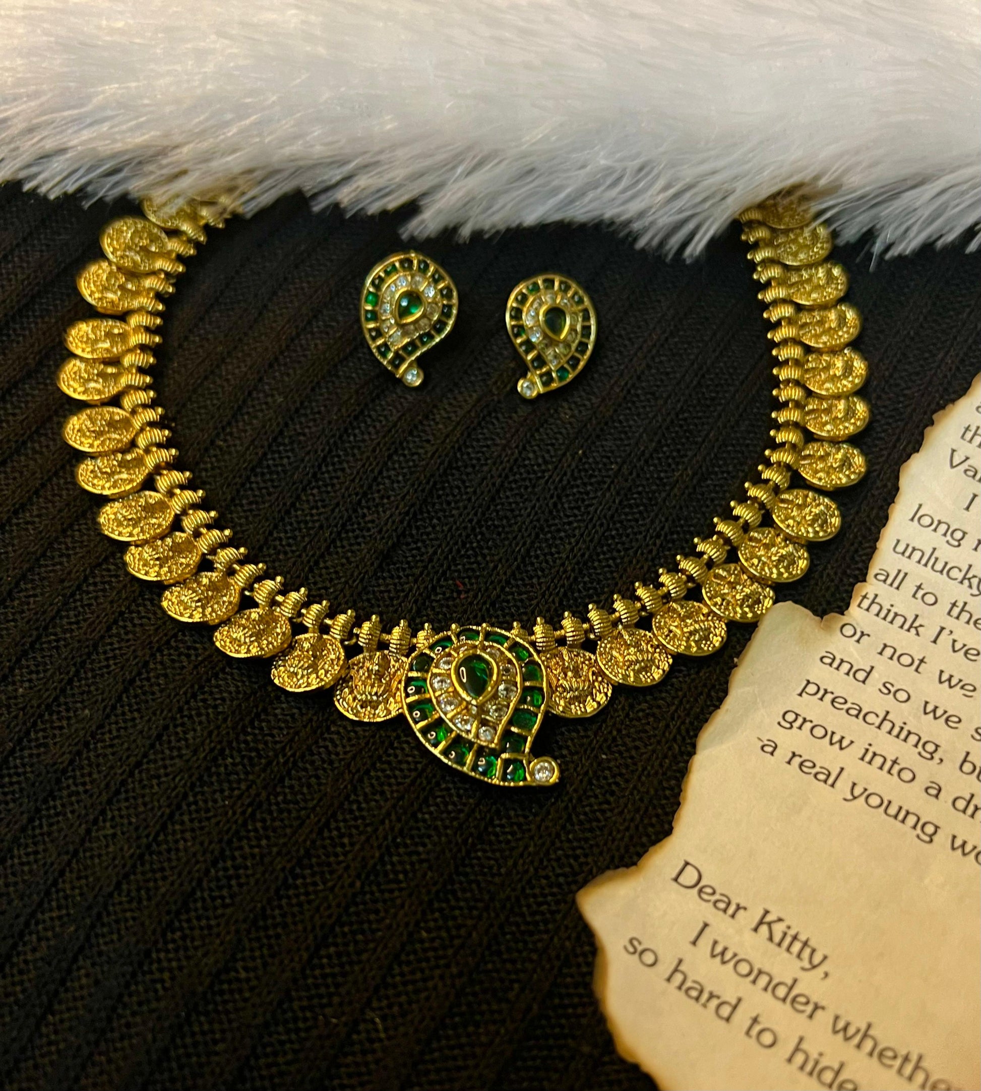 A stunning, traditional Kasumala (coin necklace) featuring gold-toned coins and an intricate central Mango pendant. Adorned with sparkling green and white stones. This set perfectly captures the grace of South Indian heritage. It comes with mango shaped earrings.