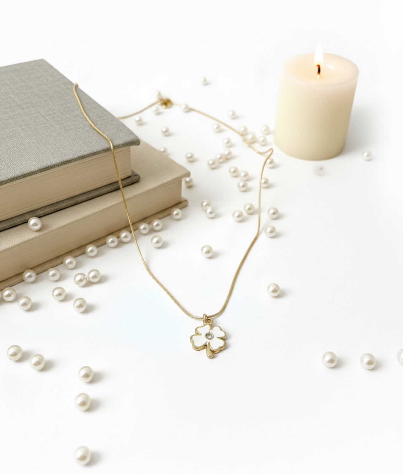 A beautiful gold-toned chain featuring a charming white clover flower pendant, symbolising good fortune and style.