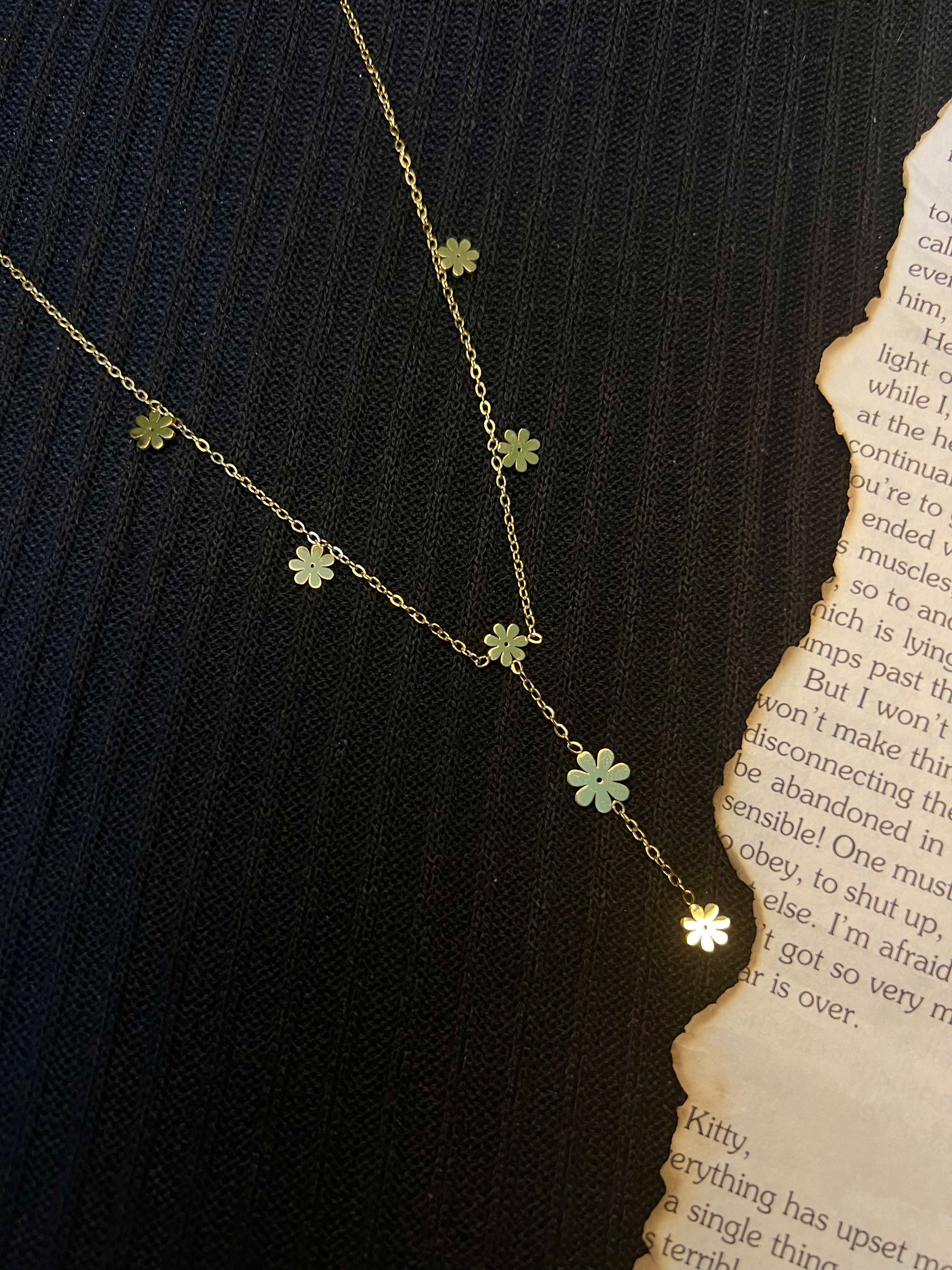 An elegant gold tone chain featuring charming, miniature flower drops.