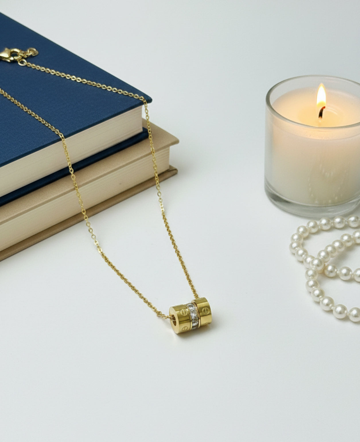 A simple gold-tone chain featuring three small, barrel shaped pendants. Perfect for minimalist lovers.